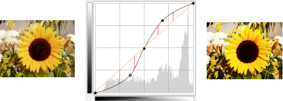 The Curves tool is the most sophisticated tool for changing the color, brightness, contrast or transparency of the active layer or a selection. While the Levels tool allows you to work on Shadows and Highlights, the Curves tool allows you to work on any tonal range. It works on RGB images.