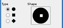 The geometry of the nib type can be adjusted by holding button 1 of the mouse on the small square at the center of the Shape icon and moving it around.