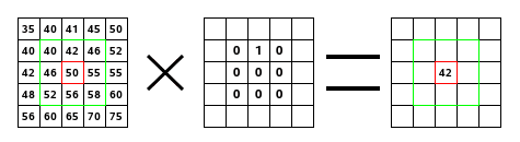 On the left is the image matrix: each pixel is marked with its value. The initial pixel has a red border. The kernel action area has a green border. In the middle is the kernel and, on the right is the convolution result.
